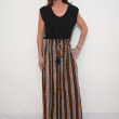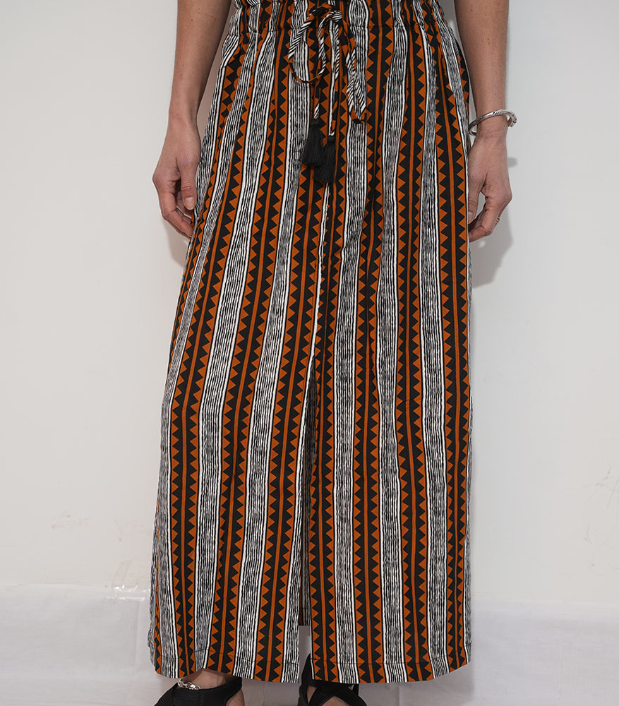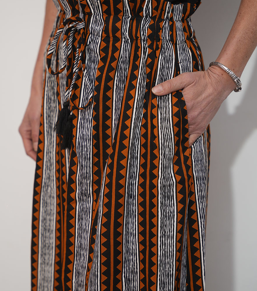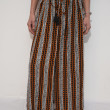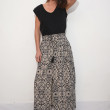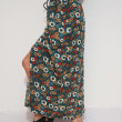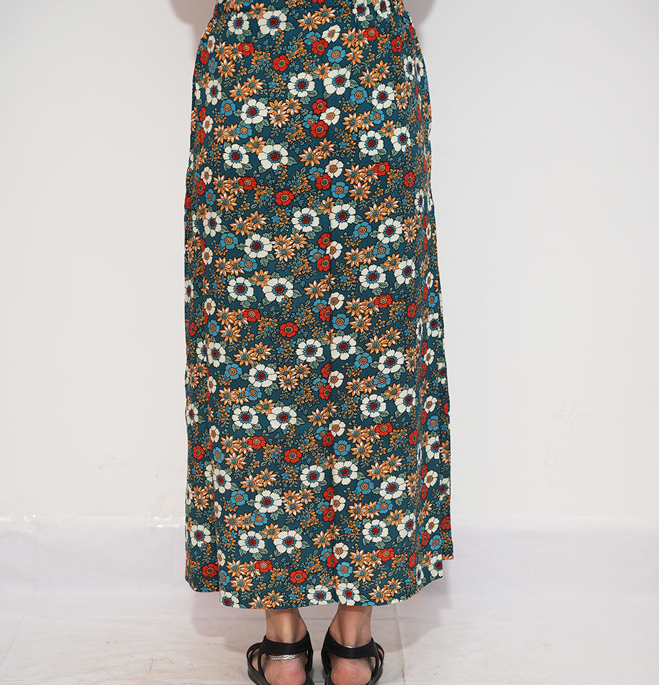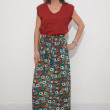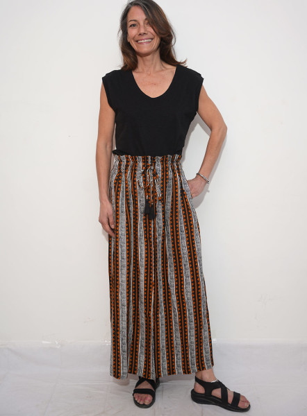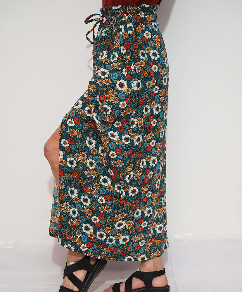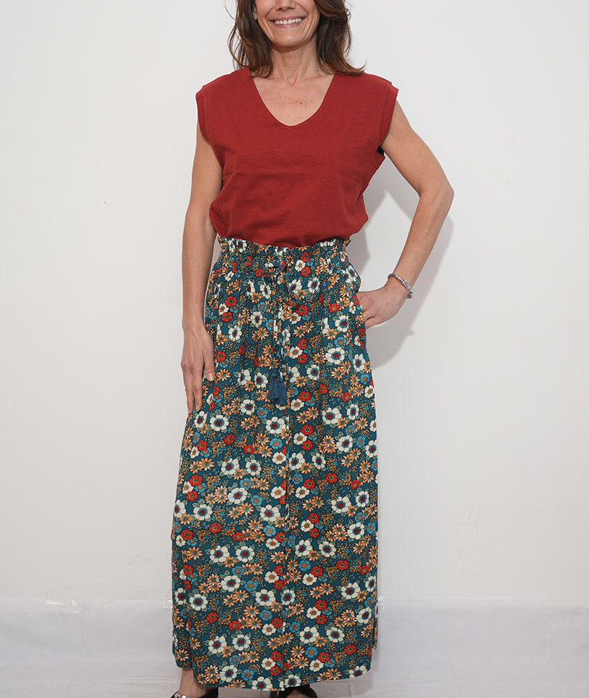 Je suis une jupe taille haute élastiquée. Ma forme est droite et je suis fendue sur le devant.